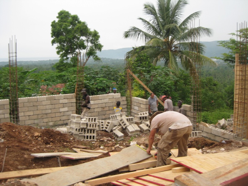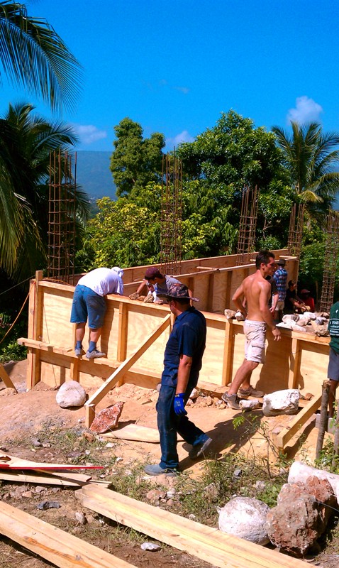 We all met in Florida and from there we took a flight towards the capital of Haiti, Port-au-Prince. There we met the Pastor Medit who picked us up on a bus at the airport and we headed toward Jacmel (a 3-hour drive through the mountainous road). We were worried it would rain all those days and we wouldn’t be able to do anything. Despite the weather forecast, the very next day was clear and everything was perfect for construction during our entire time there. As soon as we left Haiti, the storms began pouring again! The team worked in harmony and the quality and the skill of certain people who are contractors in the states was greatly appreciated. Some of the contractors came with the tools necessary for proper leveling of the foundation on a hilly elevation. Their participation in this poor country makes a great difference especially with the money because the materials are so expensive. We spent $15,560 on the foundation’s materials, which includes the sand, rocks, cement blocks, plywood, 2x4x16 wood, steel rebars for enforcement and others. People from the church came together and helped us mix the cement and pour the foundation. They sang enthusiastically and prayed together and continued to work hard. There were people of all ages working, form 5 year olds to 65 year olds, each carrying a stone or a bucket of cement. The girls thought the little children the alphabet and biblical things while being deeply touched by their love and poor lifestyle.