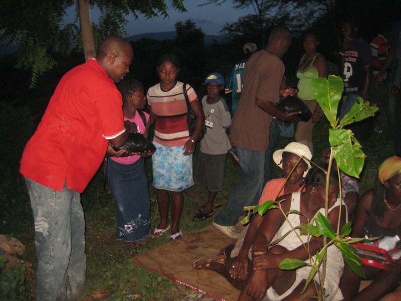 Our next destination was a town in the mountains called Jacmel. To get there we had to go back to Port-au-Prince, change our school bus to some smaller vans and drive 2 hours on the wavy road up and then down the mountain. Here the air was clean now and there was well-watered vegetation, almost jungle looking. Town after town we can see the effects of the earthquake: housed destroyed, schools in rubles some still with the dead inside, big cracks in the road, landslides, and tent camps. We got to Jacmel just in time for a church service, held at a rented location in Orangers. Pastor Medit Sanon started this church about a year ago and now it was packed with people of all ages praising God. The frequent electrical outages, bad sound system, or dire heat did not stop anyone from coming before the throne with all their hearts. In Jacmel we had similar activities as in Gonaives: worship services, seminar, and food about 200 families. Pastor Medit had a list with the very poor of around the town and part of our group visited them. It is hard to describe in words the poverty but we did what we could materially and spiritually.